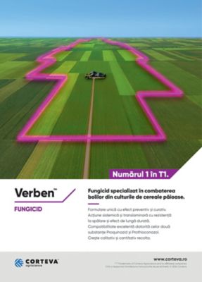 Verben™ este un fungicid unic si puternic, special creat și lansat de Corteva Agriscience pentru a asigura protecția cerealelor încă de la primul tratament din primăvară. Prin utilizarea lui Verben™ în primul tratament T1, beneficiem de puterea curativă și preventivă a celor două substanțe active conținute. Având o plantă curată chiar din T1, putem optimiza schema tehnologică, fară a face rabat de la producție, deorece planta va fi curată înca din primavară și va fi mai rezistentă în fața următoarelor valuri de infecție.