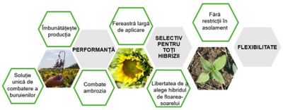 · FLEXIBILITATE – fereastră largă de aplicare – începând cu stadiul de 4 frunze complet dezvoltate ale culturii de floarea soarelui până la stadiul de buton floral