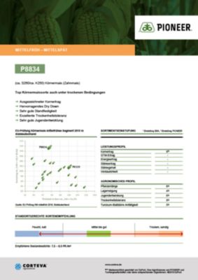 P8834 (FAO 310) – este un hibrid care se poate lupta cu hibrizi ce depășesc această maturitate. Are o productivitate excelentă, o excepțională toleranță la secetă și arșiță și o stabilitate bună. Prezintă caractere agronomice foarte bune, mai ales când vine vorba de toleranța la bolile porumbului. Acest hibrid este recomandarea specialiștilor Corteva pentru cultura dublă, chiar și după rapiță!