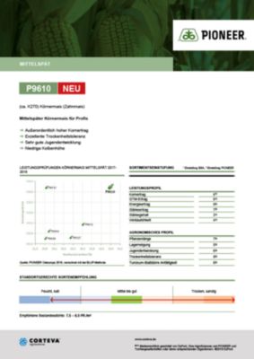 P9610 (FAO 330) – este un hibridul timpuriu, cu o deosebită plasticitate ecologică și profil agronomic puternic. Prezintă o capacitate ridicată și constantă de producție și o toleranță excelentă la secetă și arșiță. Se recomandă semănatului timpuriu!