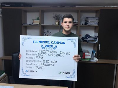Și tânărul fermier Daniel Marius Bocuța a obținut rezultate bune cu hibridul P9241, care i-a oferit o producție de 10.100 kg/ha. Acesta își desfășoară activitatea în localitatea Spiridonești, lucrează 800 ha, iar în 2020 a semănat porumb pe 240 ha. “Am semănat porumbul după grâu, astfel că am arat terenul, l-am pregătit cu discul în primăvară și am semănat la începutul lunii aprilie. Fertilizarea a constat în 200 kg/ha de uree aplicată la pregătirea patului germinativ, apoi la semănat am aplicat 180 kg/ha de îngrășământ complex 20.20.0, dar și îngrășământ microgranulat - 25 kg/ha, după care în vegetație, în stadiul de 8 frunze, am mai administrat nitrocalcar – 200 kg/ha. Am administrat și un erbicid, precum și un foliar în stadiul de 6-7 frunze. La jumătatea lunii octombrie am recoltat și pentru anul dificil pe care l-am traversat, pot spune că am avut o producție bună. În 2019 acest hibrid mi-a oferit 14.700 kg/ha, de aceea îl voi alege și în această campanie când voi semăna în jur de 160 ha cu porumb”, a precizat fermierul campion.