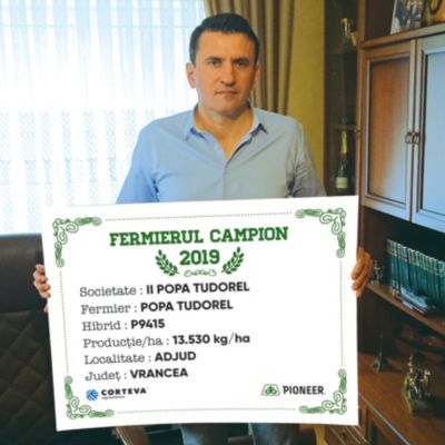În județul Vrancea, fermier campion a devenit domnul Tudorel Popa, care a cultivat hibridul P9415 și a obținut 13.530 kg/ha. „Lucrez 100 ha, iar porumb am avut în acest an pe 70 ha. Am ales pentru toată suprafața hibridul P9415 și am semănat, fie după rapiță, fie după grâu. Terenul a fost scarificat, arat și am administrat îngrășământ complex 18.46.0 – 100 kg/ha, în primăvară, cu 2 săptămâni înainte de semănat, am mai administrat nitrocalcar 200 kg/ha. Am semănat pe 10 și 11 aprilie și am aplicat în același timp 100 kg/ha îngrășământ 20.20.0 + zinc, densitatea pe care am ales-o a fost de 65.000 plante. În vegetație, atunci când plantele aveau în jur de 6 frunze, am mai administrat încă 200 kg/ha de nitrocalcar. Cultura a primit 3 erbicide, unul înainte de răsărire și două de corecție în stadiul de 2-4 frunze, am mai administrat și un îngrășământ foliat cu zinc, atunci când plantele aveau în jur de jumătate de metru. A fost un an bun, sunt mulțumit de cum s-a comportat hibridul, însă anul viitor vreau să aplic o tehnologie mai avansată, aș vrea să aplic stabilizatorul N-Lock™, vreau să depășesc această producție. Voi semăna și anul viitor în jur de 70 ha cu porumb, voi alege același hibrid – P9415 și noul în testare”, a declarat fermierul campion.